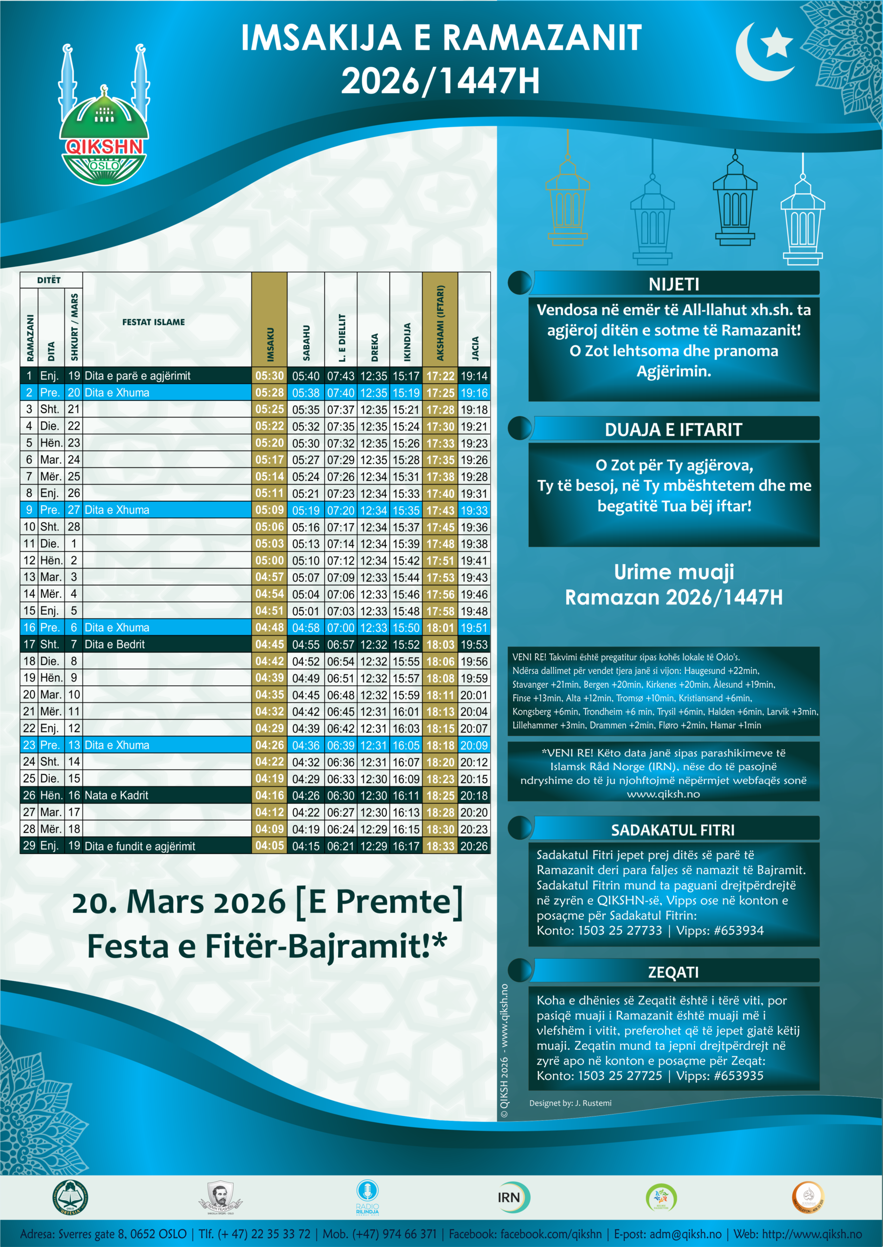 Këshilli Islam i Norvegjisë (IRN) dhe Rrjeti i Dialogut Musliman (MDN) njoftojnë se Ramazani 2026 fillon ditën e Enjte, më 19. Shkurt 2026.